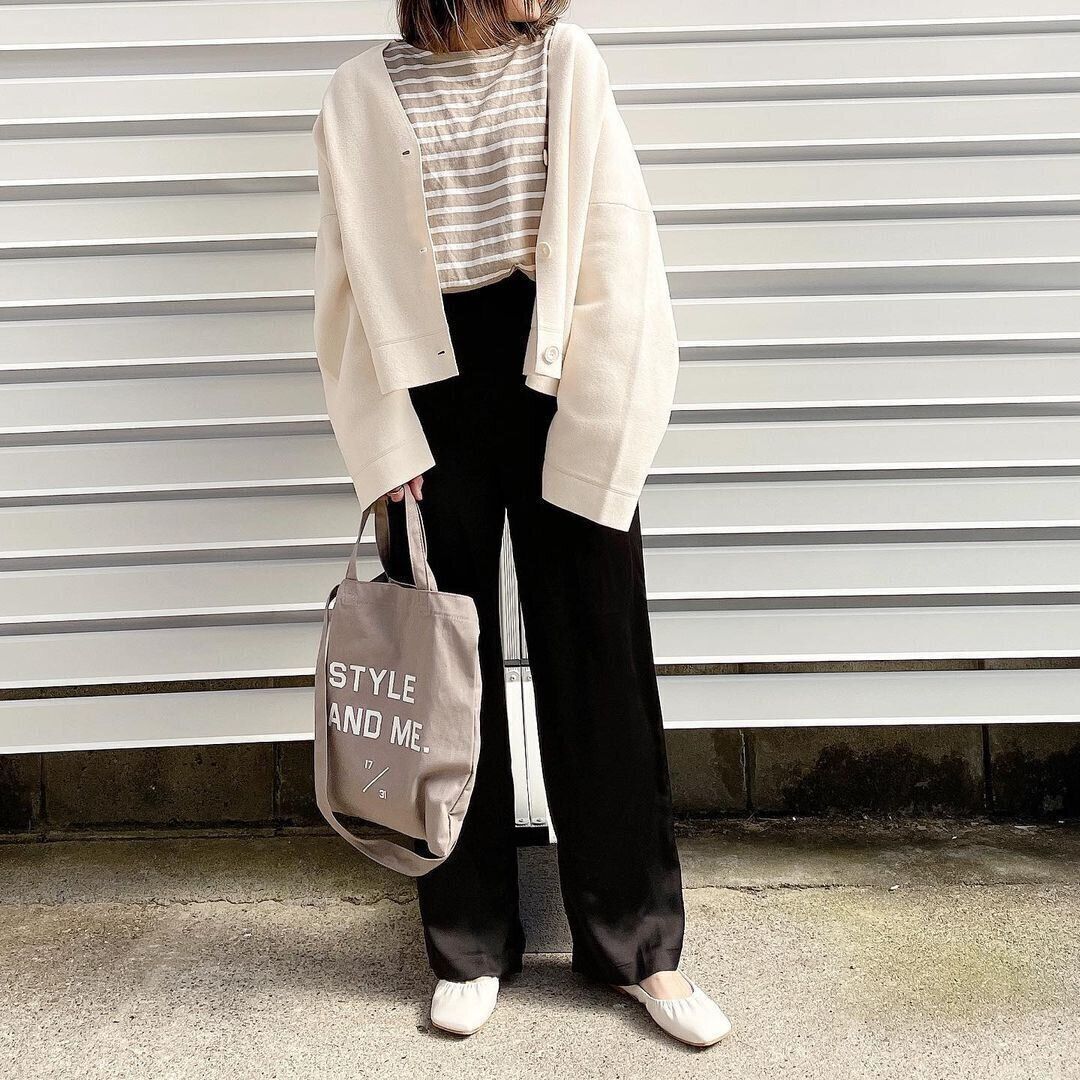 華やかな「サテンリラックスストレートパンツ」(2,990円)は、シックなトーンでまとめると程よいバランスに。カジュアルなボーダーアイテムもサテンパンツと組み合わせることでクラス感が増すのです。