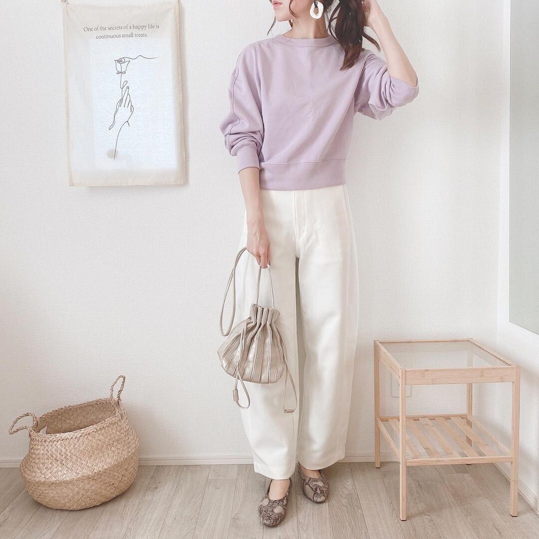 色で春らしさをアピールしてみるのもいいでしょう。先ほどと同じ「スウェットクルーネックシャツ」ですが、白ボトムを持ってるなら、ラベンダー色のスウェットも素敵です。