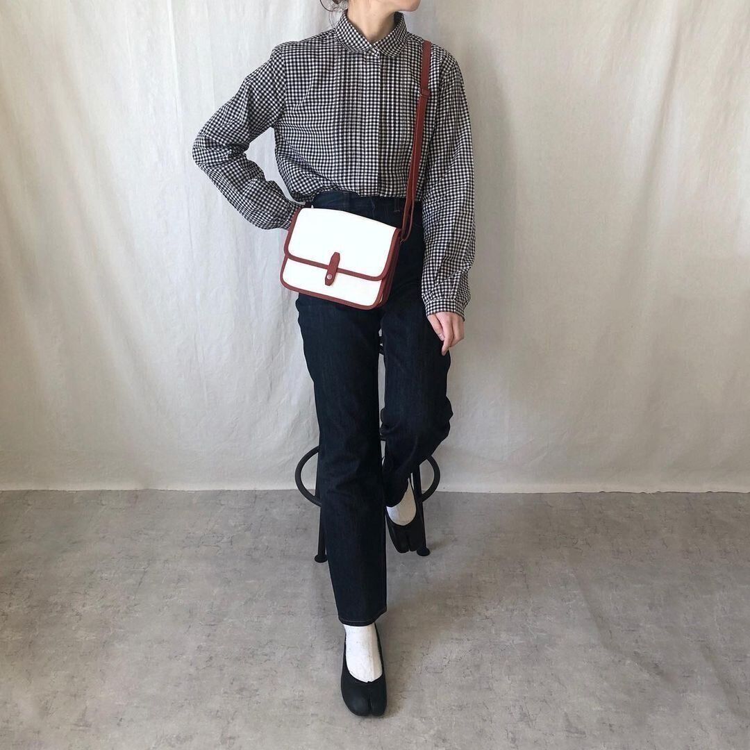 カラーアイテムに抵抗がある人は、モノトーンコーデのオシャレを極めてみるのもおすすめです。トラッドな気分を後押ししてくれるギンガムチェック柄のシャツはイネスコラボの「コットンローンチェックシャツ」(1,990円)です。小ぶりなえり元がエレガントな印象をつくってくれて◎。