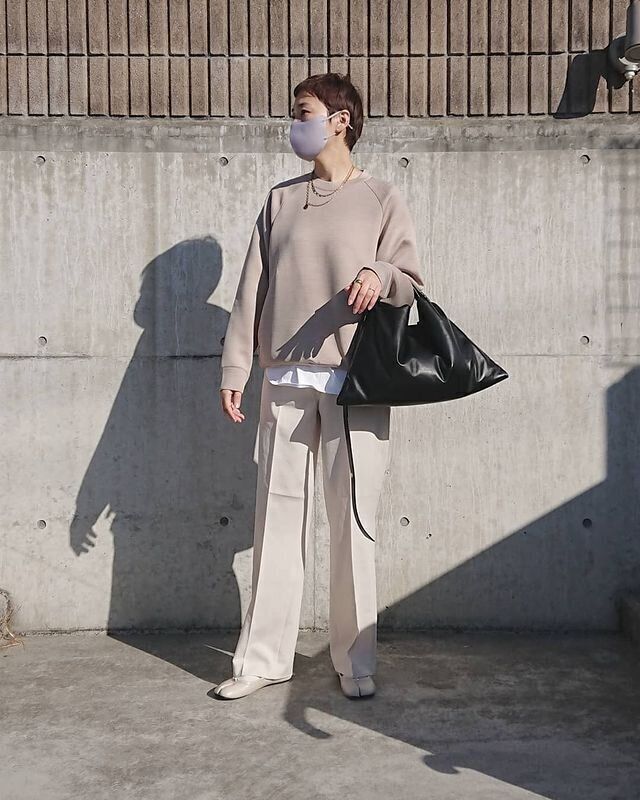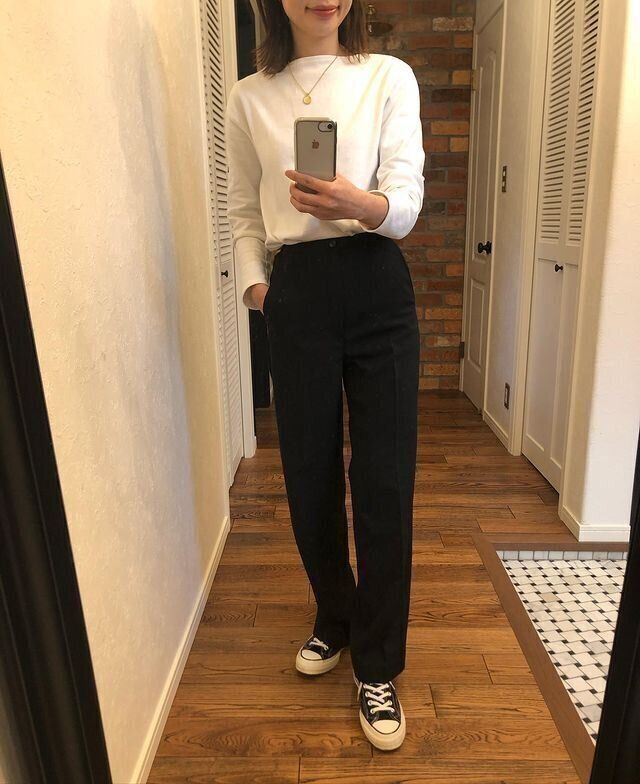 シンプルなモノトーンコーデも、形がきれいなパンツで大人らしく抜け感ある印象に◎。