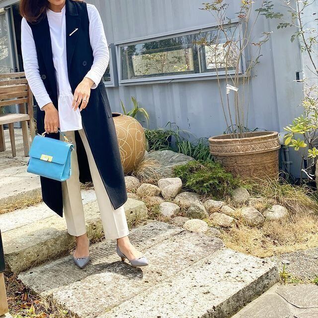 春らしいホワイトのパンツを、ブラックのロングジレでモードに味つけ。ベーシックなモノトーンコーデに、バッグと靴でカラーアイテムをプラス。