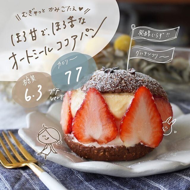 発酵不要でつくれる、グルテンフリーのココアパン。オートミールを使った歯応えのある生地で、ほろ苦くほんのり甘いココアの香りが広がるのだとか。豆乳カスタードクリームやマスカルポーネチーズ、ナッツバター、フルーツなどをはさんでアレンジしても◎。おやつや朝食にもおすすめです。