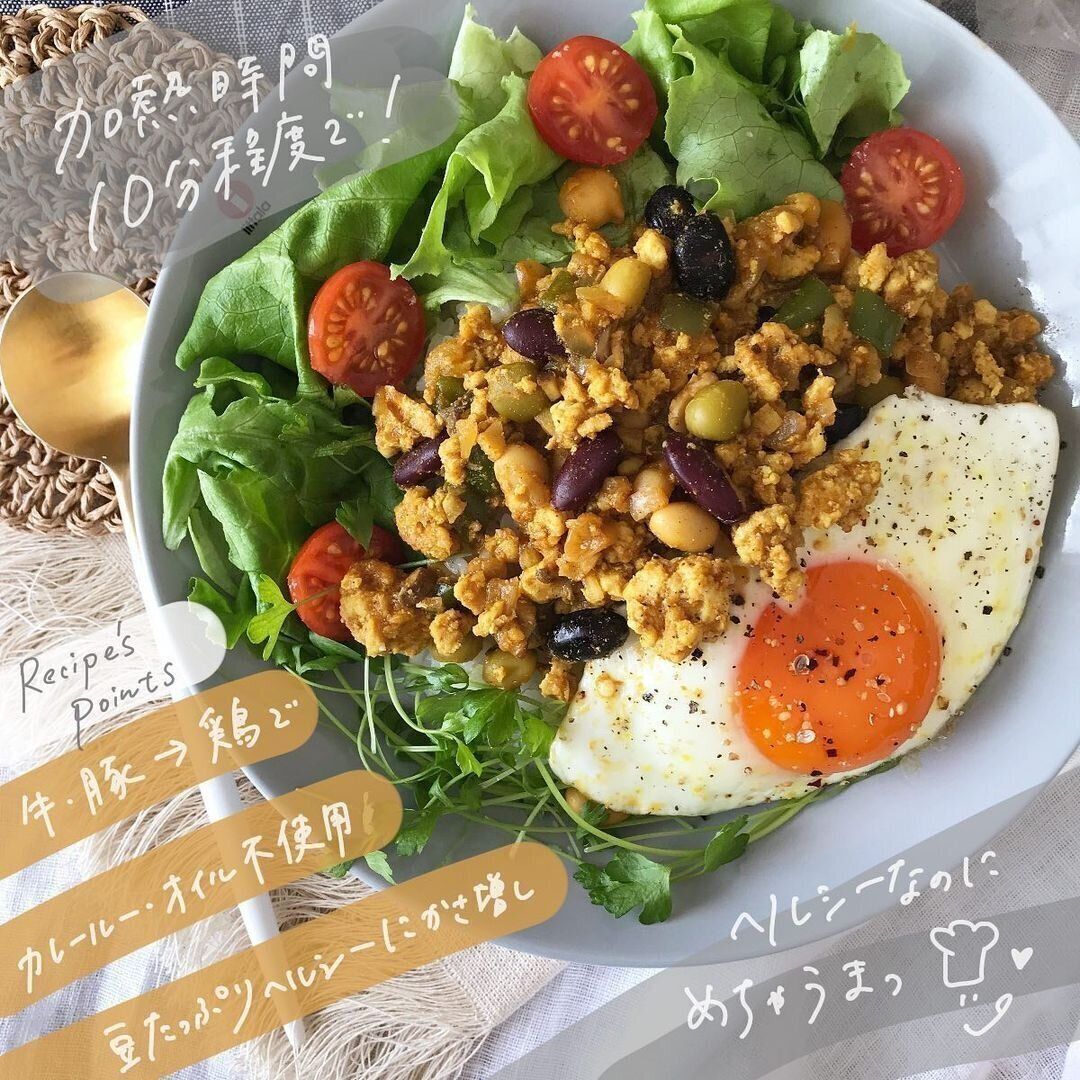 気軽にたんぱく質がとれてカロリーダウンもできる、鶏キーマカレーのレシピです。材料に鶏ひき肉・玉ねぎ・ピーマン・きのこ・豆を使っています。カレー粉・ニンニク・しょうが・コンソメなどで味つけして、いっしょに電子レンジで加熱すればできあがりです。油を使わず時短調理もできて、いいこと尽くしの一品。