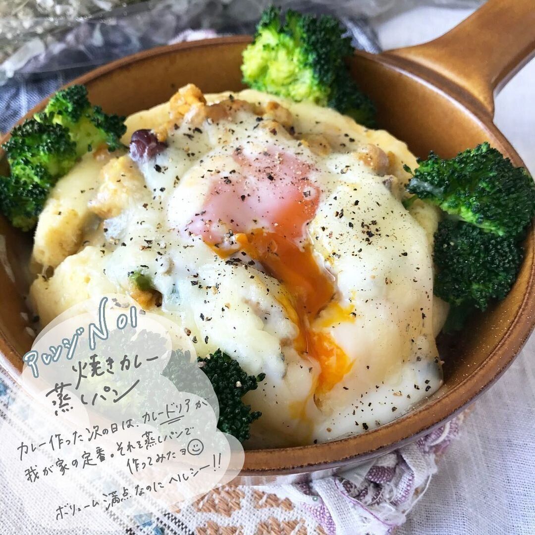 こちらは、前日の鶏キーマカレーとおから蒸しパンを組み合わせたアレンジレシピ。つくり方は、おから蒸しパンの内側を四角くくへこませてカレーを詰め、生卵・チーズ・ブロッコリーなどをトッピングしてトーストするだけ!ボリューム満点なのにヘルシーなのがうれしいですね。