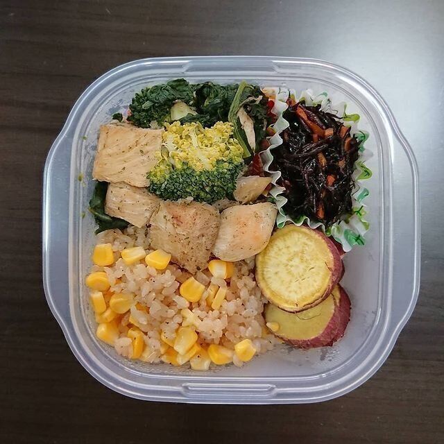 職場には、週2回お弁当を持参しています。基本メニューは、鶏むね肉かささみ、ブロッコリーやほうれん草、ひじき煮、ゆでたカボチャか蒸したさつまいも、玄米など。いそがしくても続けやすいように、手間のかからないシンプルなものばかりです。油を使わずに調理するのもポイントだといいます。
