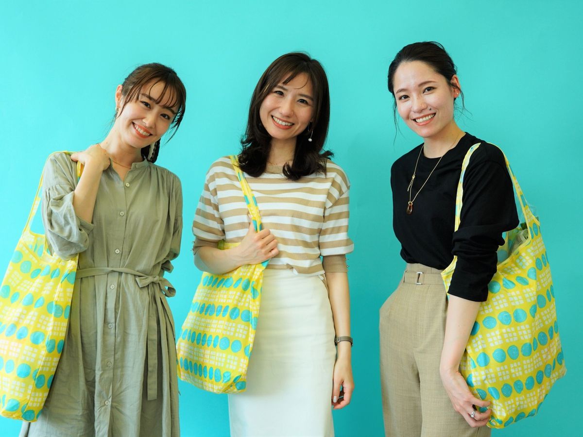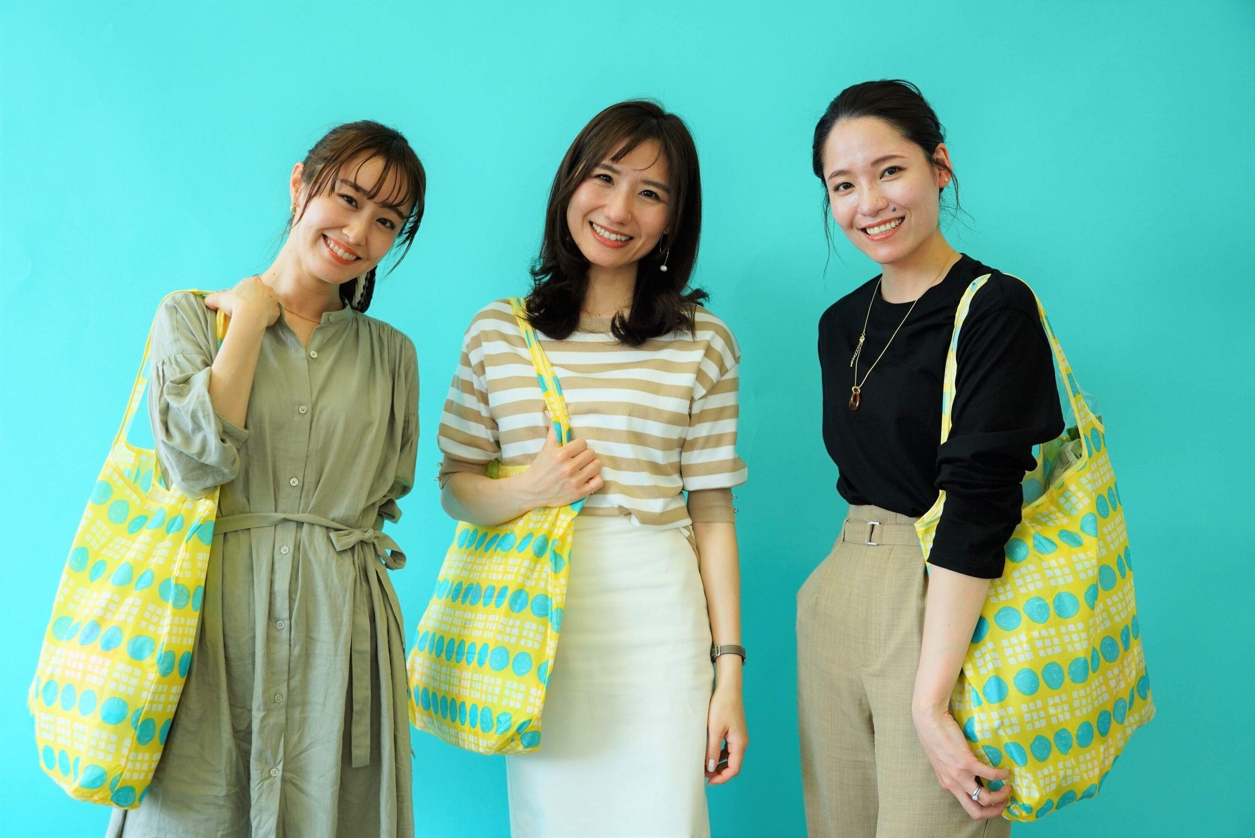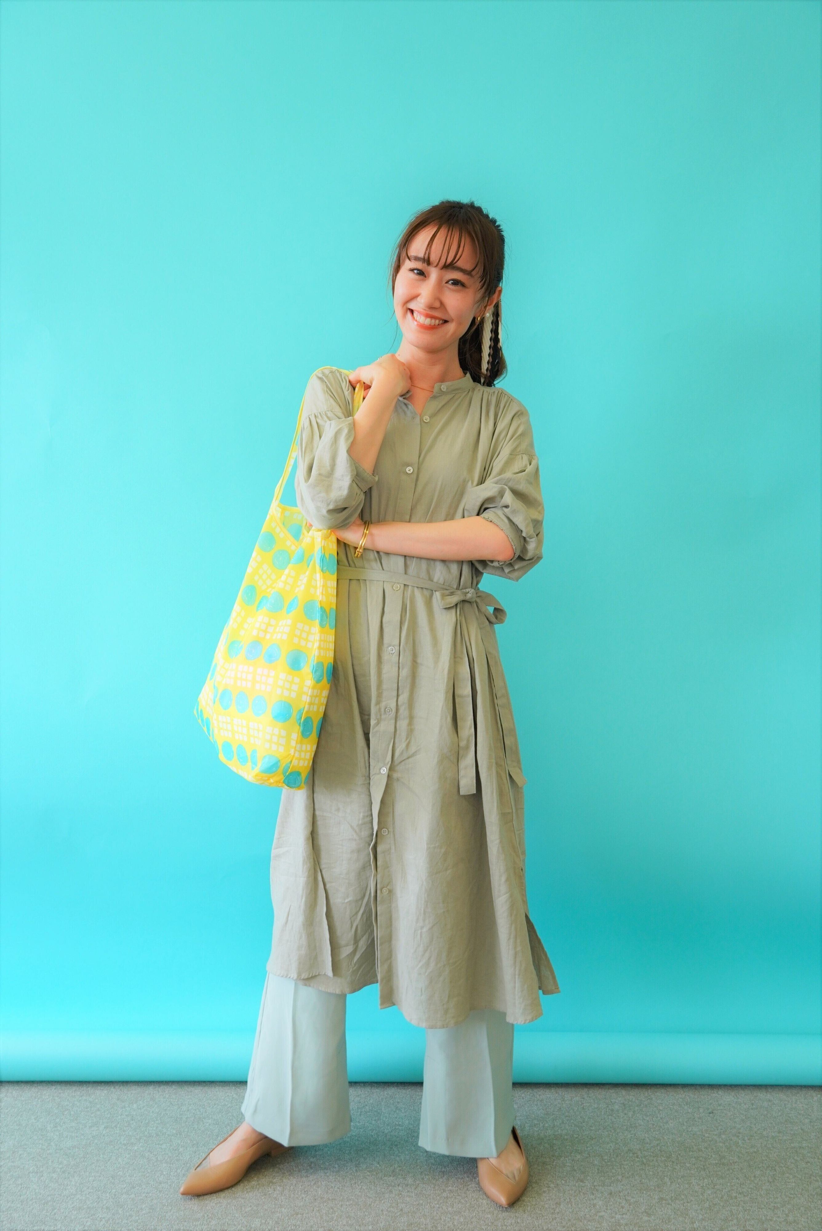 エコバッグの黄色が差し色となり、全体が華やかな春らしい印象になっています。