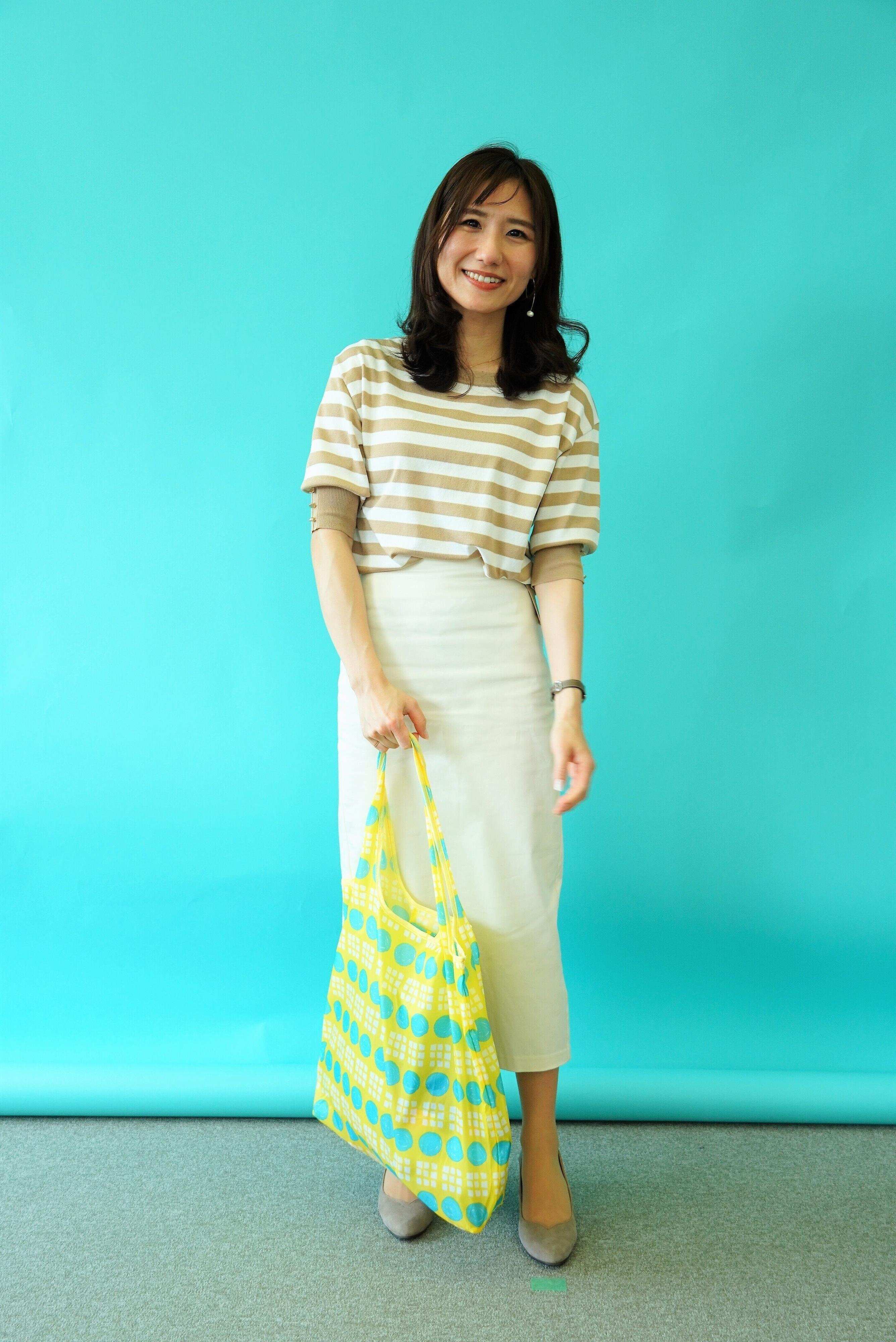 シンプルなスカートに、ボーダートップスという組み合わせが大人女子、高田さんの上品さを際立たせます。スカートの後ろには、スリットが入っているので歩きやすさも◎