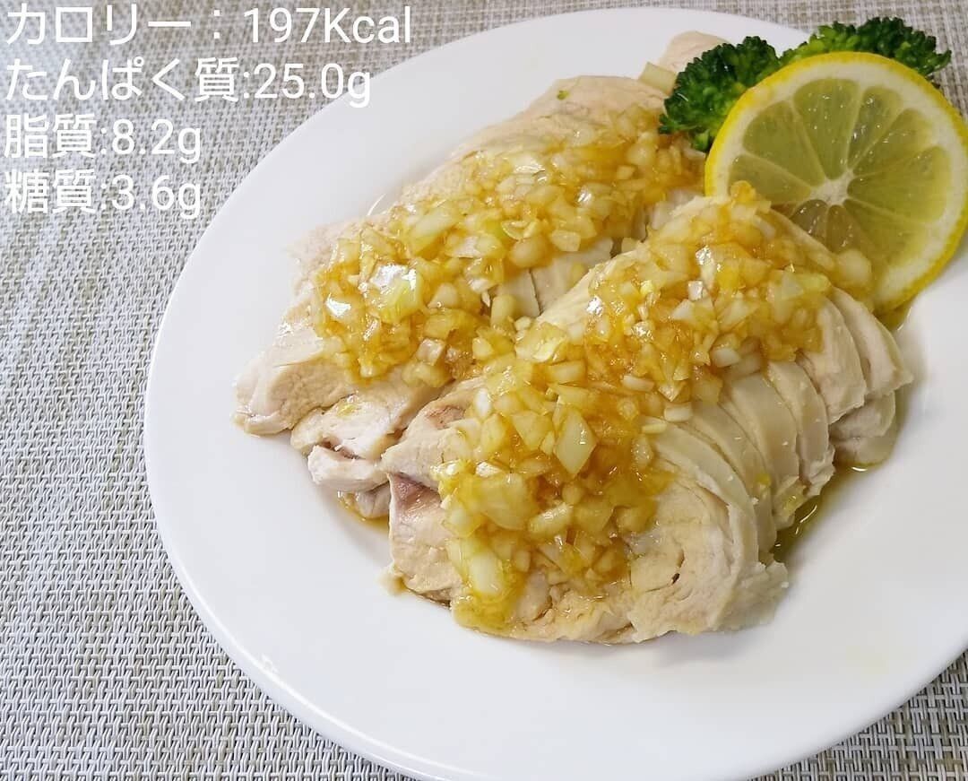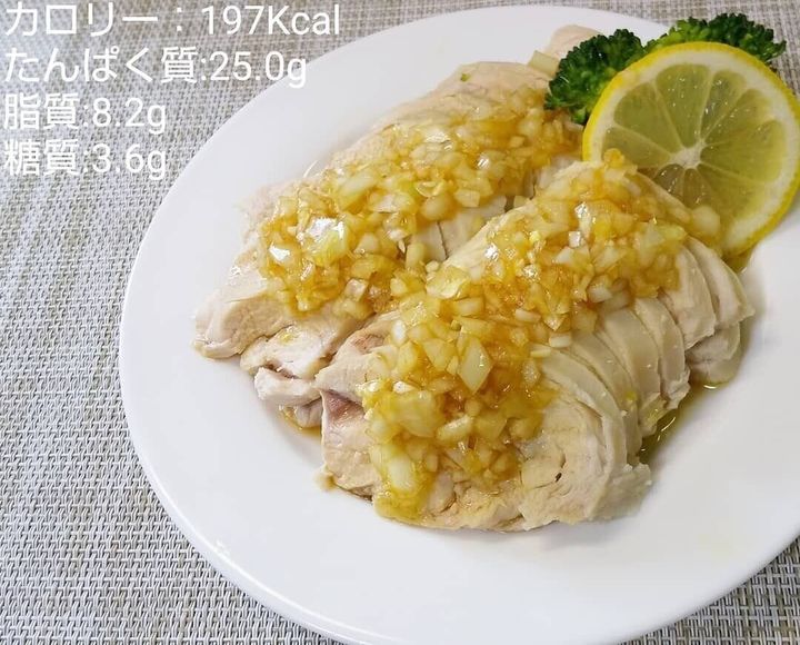 この日は、しっとり食感の鶏胸肉メニューをつくりました。作り方は、鶏肉を開いて砂糖と塩こうじをもみ込んだら、三つ折りにしてラップで包み電子レンジで加熱するだけ。ラップは2重にすると、余熱で火が通りやすくなるそうです。ブロッコリーやスライスしたレモンを添えたら、タレをかけて食べましょう。