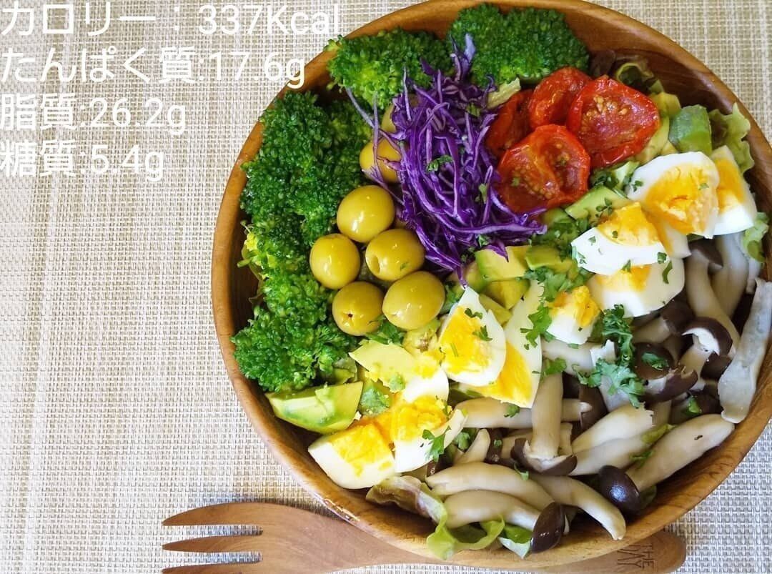 食べ過ぎてしまった次の日には、ワンプレートで野菜をたくさん食べられるサラダをチョイス。ドライトマト・サニーレタス・ブロッコリー・しめじ・アボカド・ゆで卵・レッドキャベツ・オリーブを彩りよく盛りつけています。仕上げのドレッシングとして、オリーブオイルをかけるのがおすすめ。