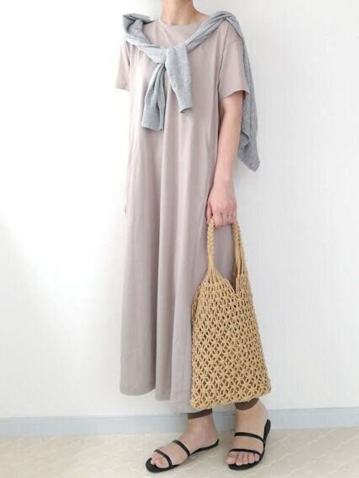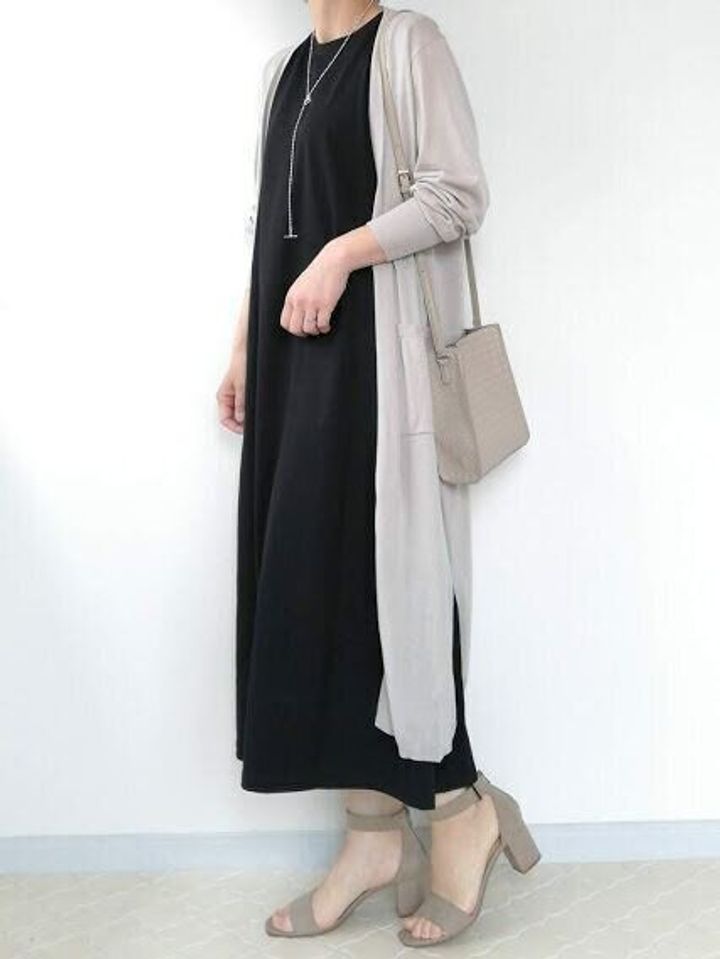 のっぺり見えがちな無地のロングワンピースは、カーディガンを肩かけするのがイチオシ。ひと手間でこなれた印象にワンランクアップできますよ。