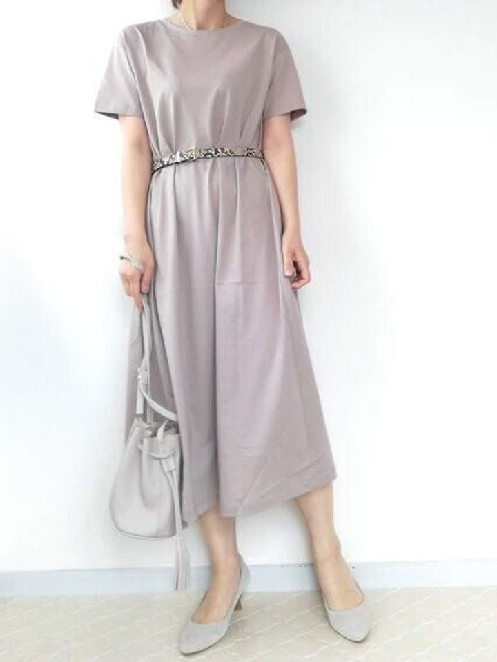 ヒールパンプスを合わせて、きちんと感をプラスした大人らしさのあるコーディネートに。パイソン柄のベルトで、無地ワンピースにさりげないアクセントをプラス。