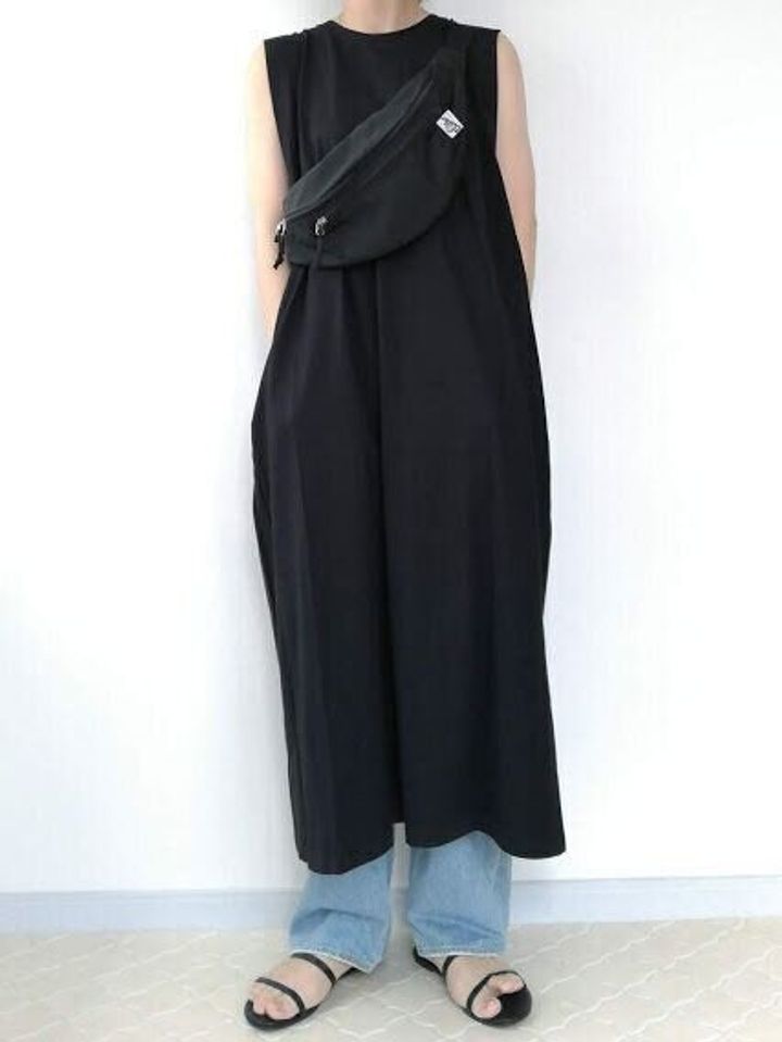 ノースリーブなので、カーディガンを羽織っても腕部分がもたつかないのがうれしいポイント。ヒールサンダルやネックレスを合わせて、品よく大人らしい着こなしに。