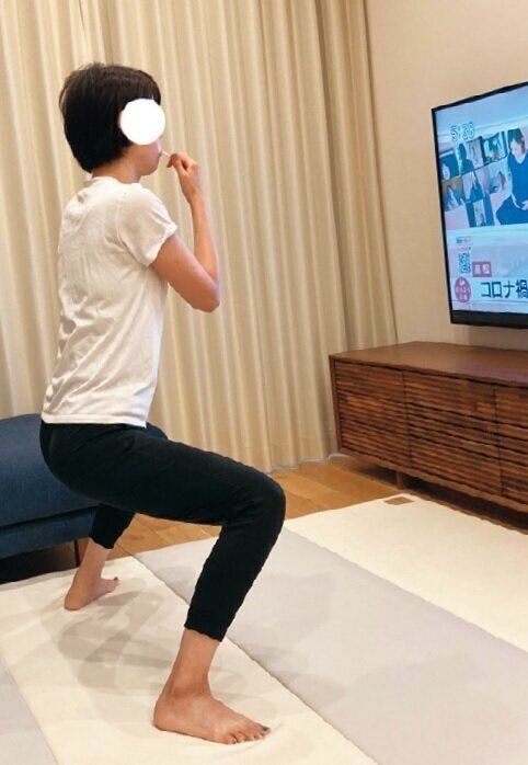 すき間時間に、YouTubeのエクササイズや足パカ運動を。「5~10分で手軽にできるものを選んでやっています。1回数分でも、毎日続けることで確実に効果が出ています」。