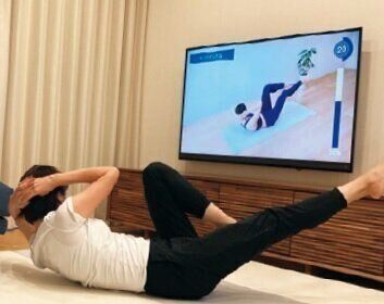 自粛期間中、外に出る機会がグッと減ったことでぽっこりお腹に。「『FiNC』というアプリで歩数を測り、歩くことを意識しました。アプリ内に、ワークアウトヨガの動画があり、それを見て朝ヨガも開始。さらに動画サイトで『腹筋2分間チャレンジ』に挑戦したら、お腹がスッキリしてきました」。