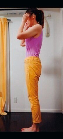 「人前に出る機会が減り、ゴム入りワイドパンツばかりはいていたのもぽっこりお腹になった原因。家でもハイウエストのヨガパンツにして体形を意識しました」。
