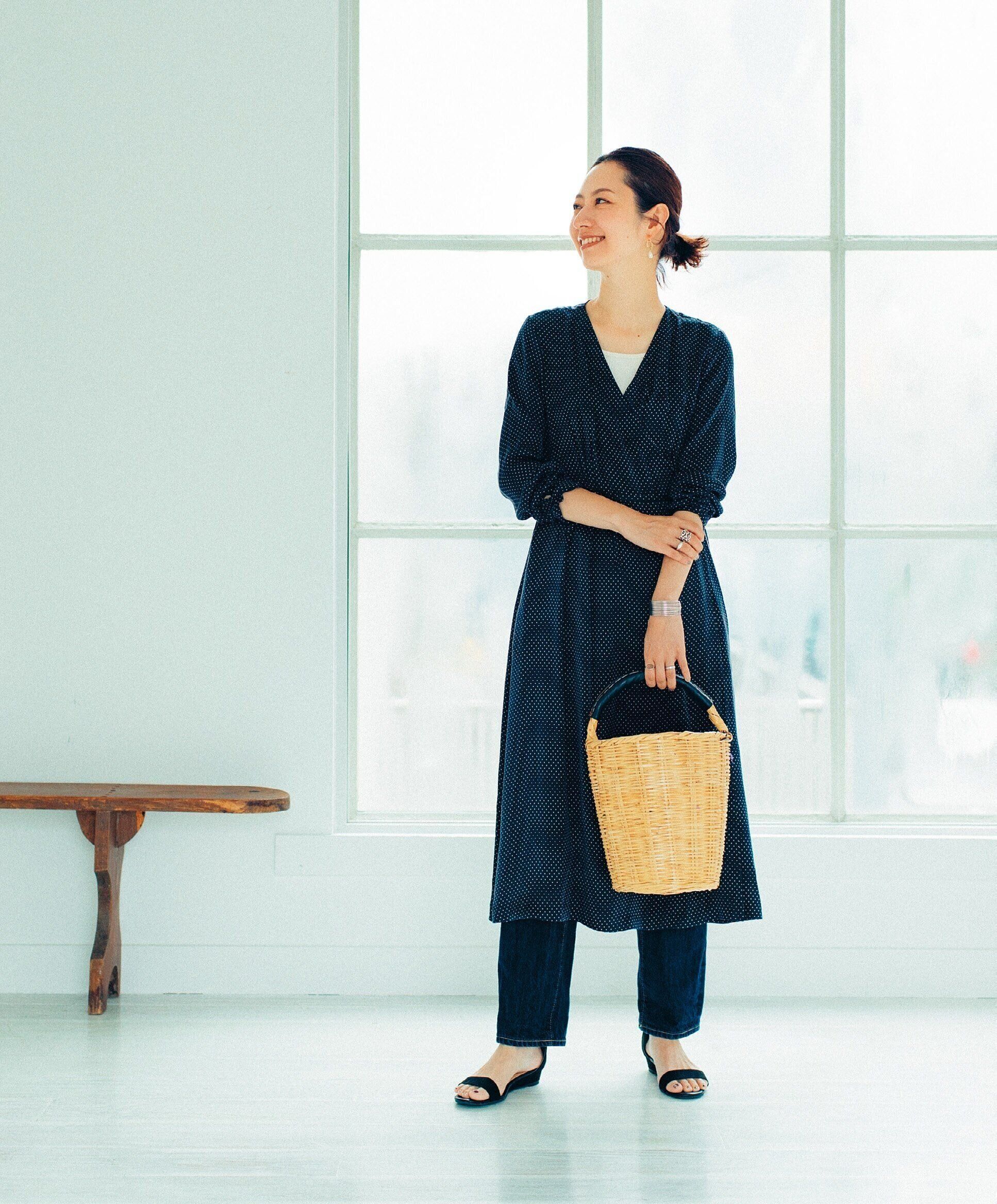 肌のくすみや小ジワが気になりだしたら、服はツヤのある物を選ぶのが若見えの最短コース。フェミニンなデザインのワンピースをあえてカジュアルダウンさせると、大人女性ならではの愛嬌が出ます。