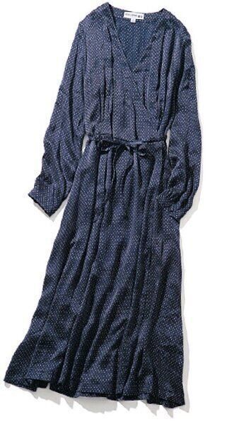 品のいい光沢のシルク素材。ネイビーのベースに、ベージュのドットが落ち着いた印象。パンツなしで着れば、ドレッシーにも仕上がる(ニクロ/イネス・ド・ラ・レサンジュ) ※一部店のみで販売。