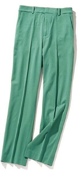 パステルほど明るくはないスモーキーグリーンは、40代にハマる色。センタープレスできちんとして見えるけれど、実はトレッチがきいてて動きやすい。