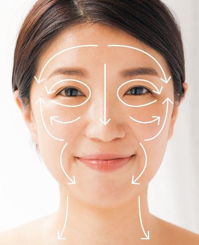 スキンケア化粧品をなじませるときは、顔の筋肉の大まかな方向に従って行うのが基本。リンパの流れに沿って"下から上へ"、"中から外へ"を意識しながら指を軽やかに動かして。