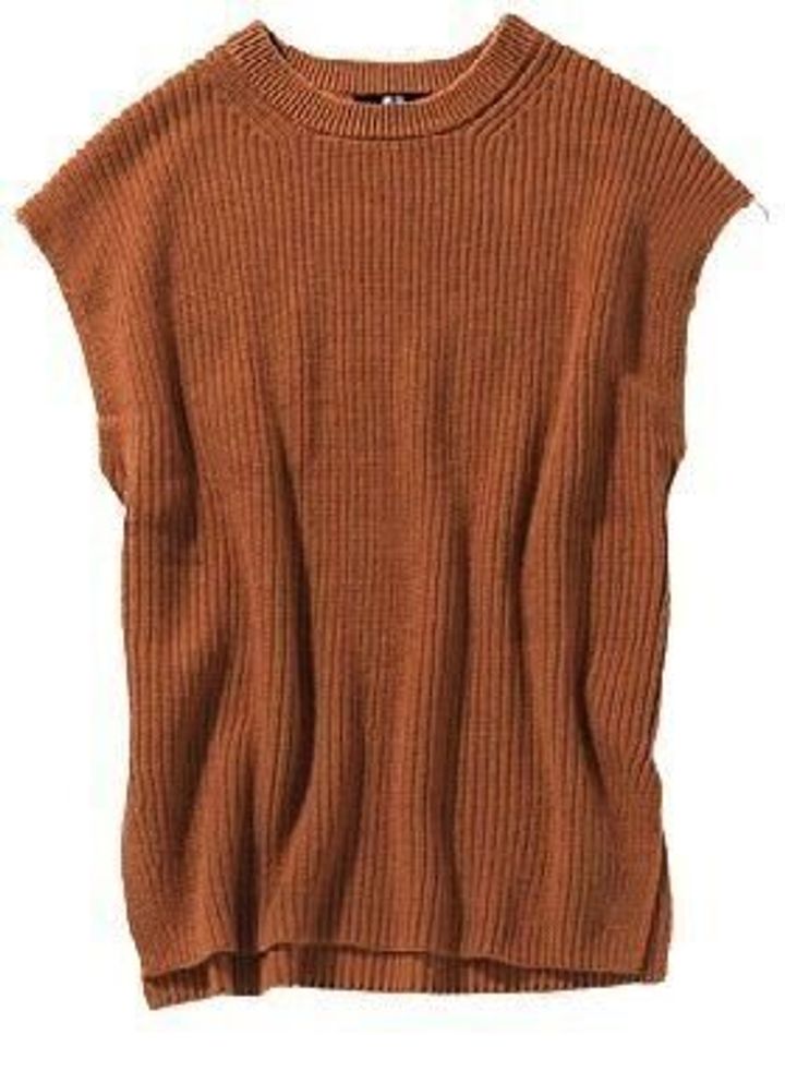 ざっくり編まれた厚みのあるニットは、ナチュラルさん向き。フレンチスリーブで二の腕の太さをカバーし、濃いめのブラウンで、引き締め!/ユニクロ