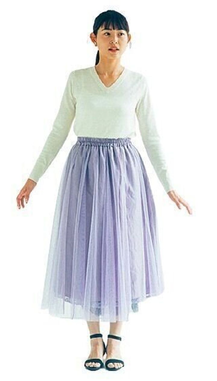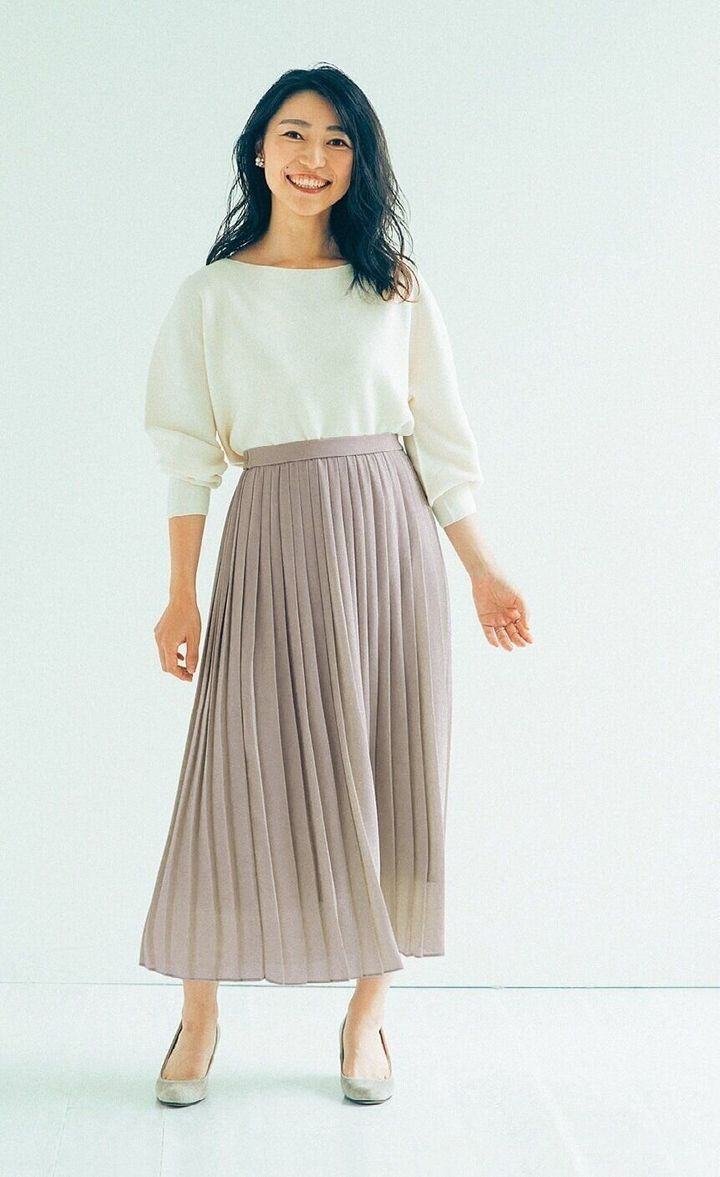 ふんわりしたセーター+シフォンスカートはウェーブさんの着やせ鉄板コーデ。全体を明るめのトーンでまとめると、フェミニンな魅力がさらに際立つ。