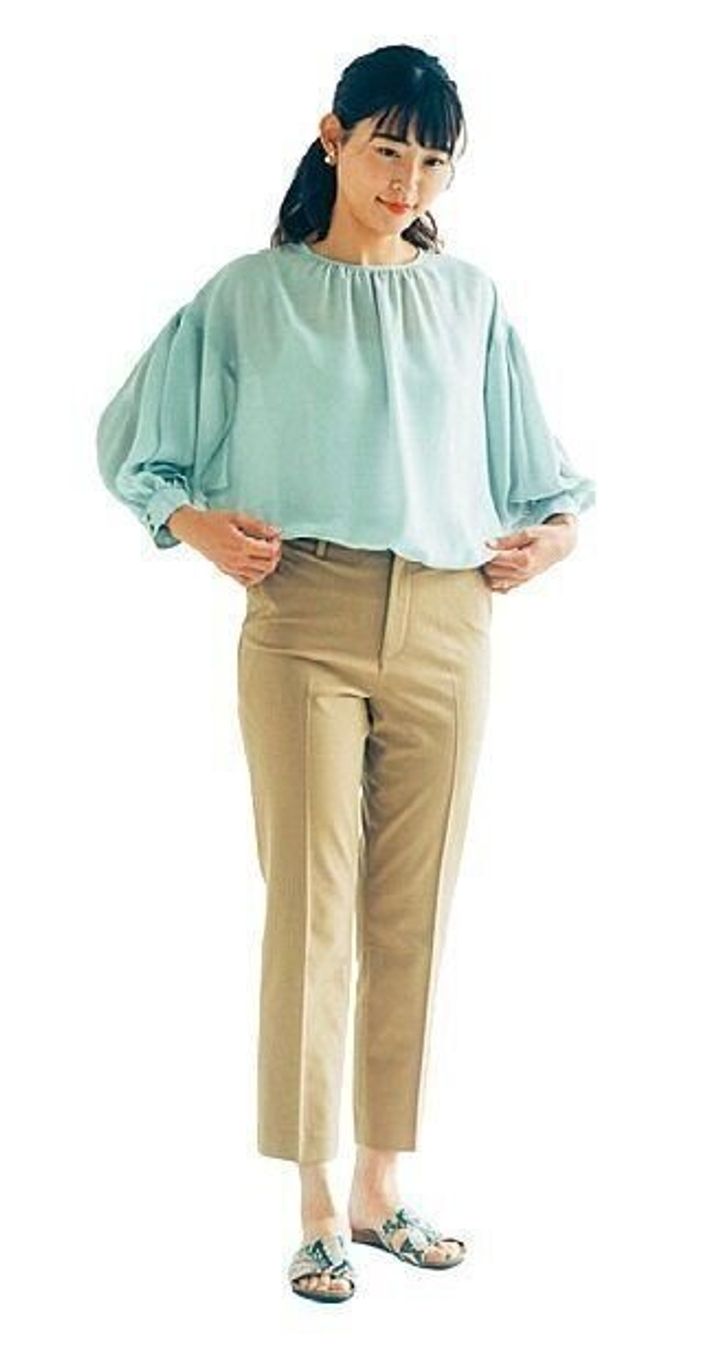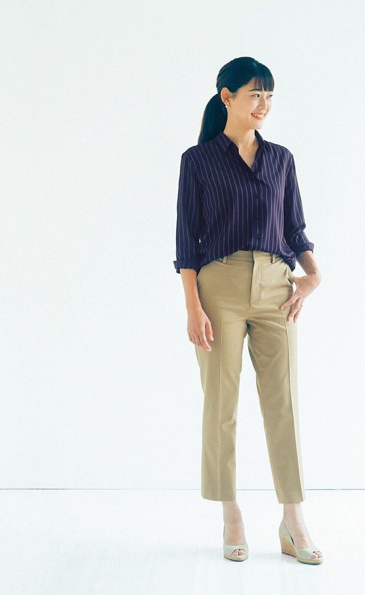 ストレートさんの着やせの基本は、ベーシックなアイテムを組み合わせる引き算コーデ。シンプルなシャツとパンツで縦長なシルエットをつくると細見えする。
