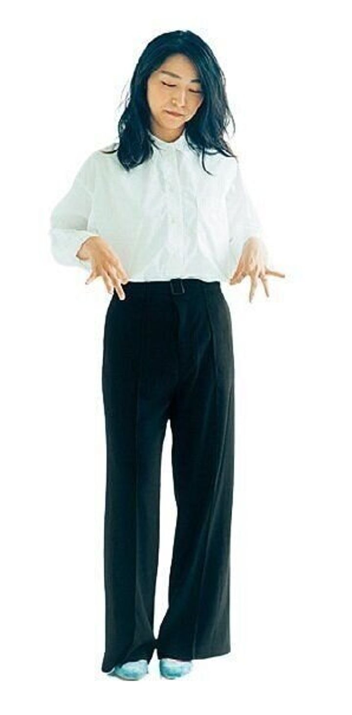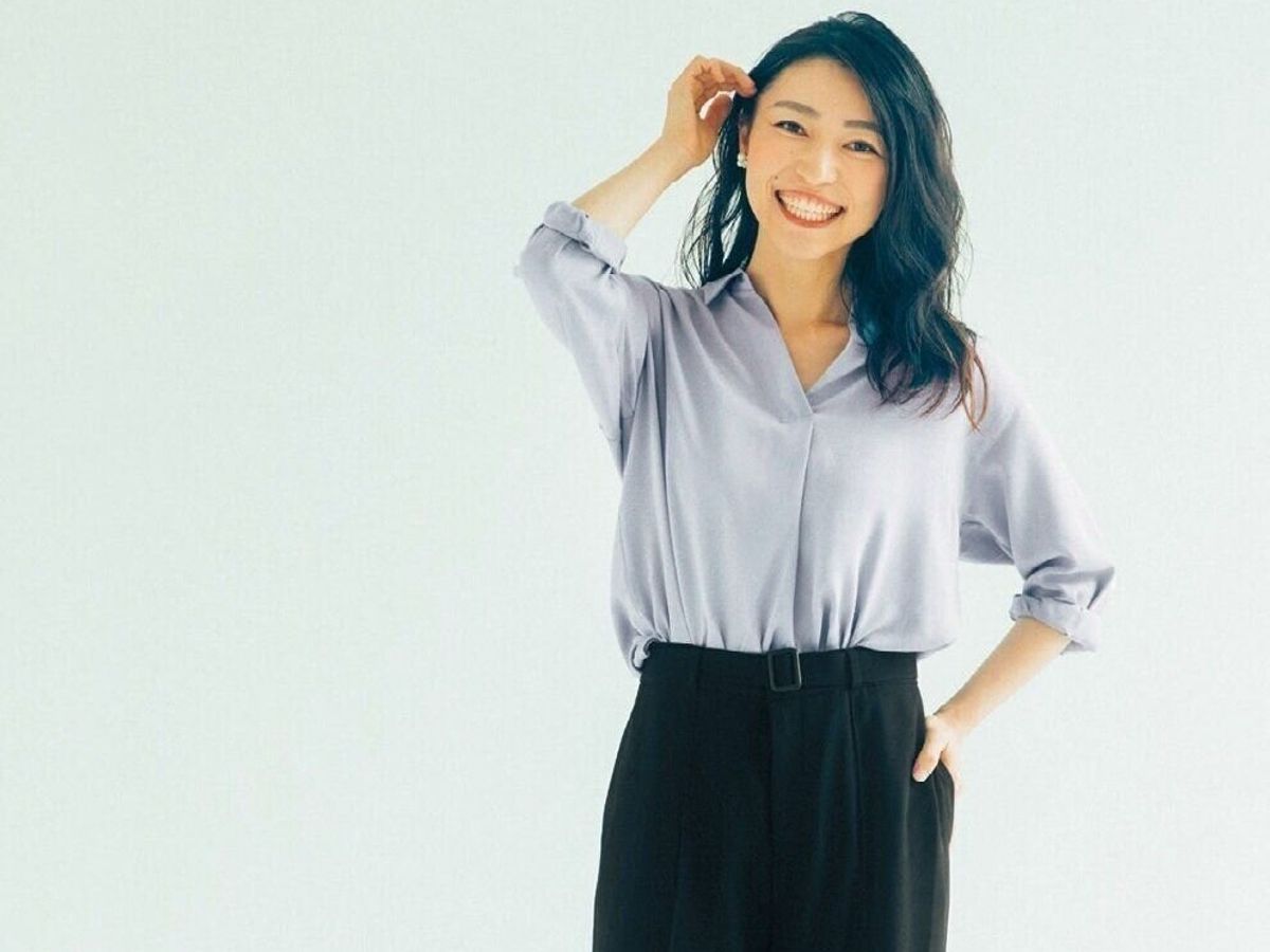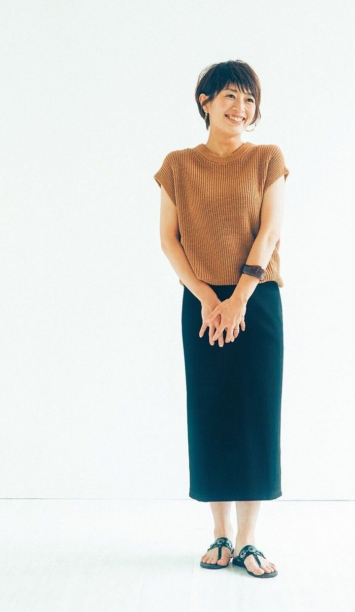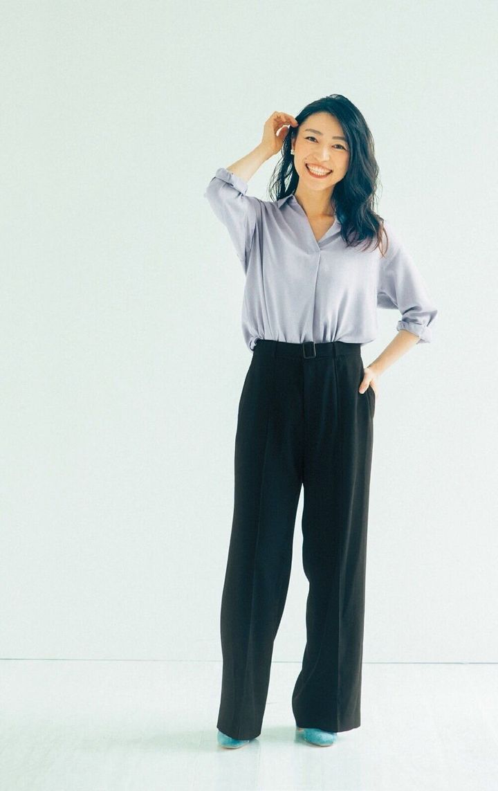 身長157cm。骨格がしっかりしているナチュラルタイプ。「ウエストに比べると脚がしっかりして見えるのが悩み。特にパンツ選びにいつも迷います」。
