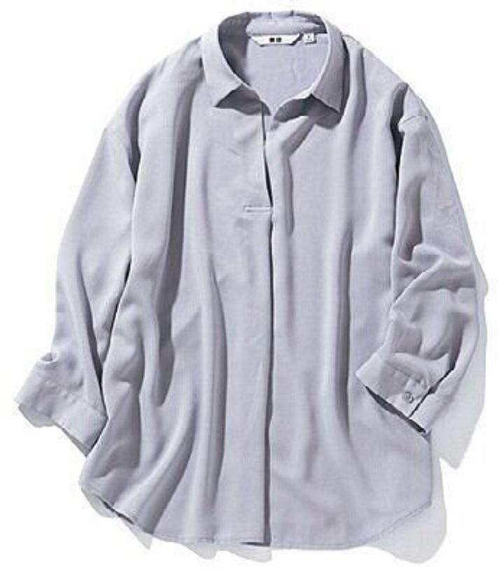 ウェーブさんに似合うソフトな風合いのブラウス。柔らかくて光沢のある生地とスキッパーデザインで、持ち味である華やかさが引き立つ。/ユニクロ