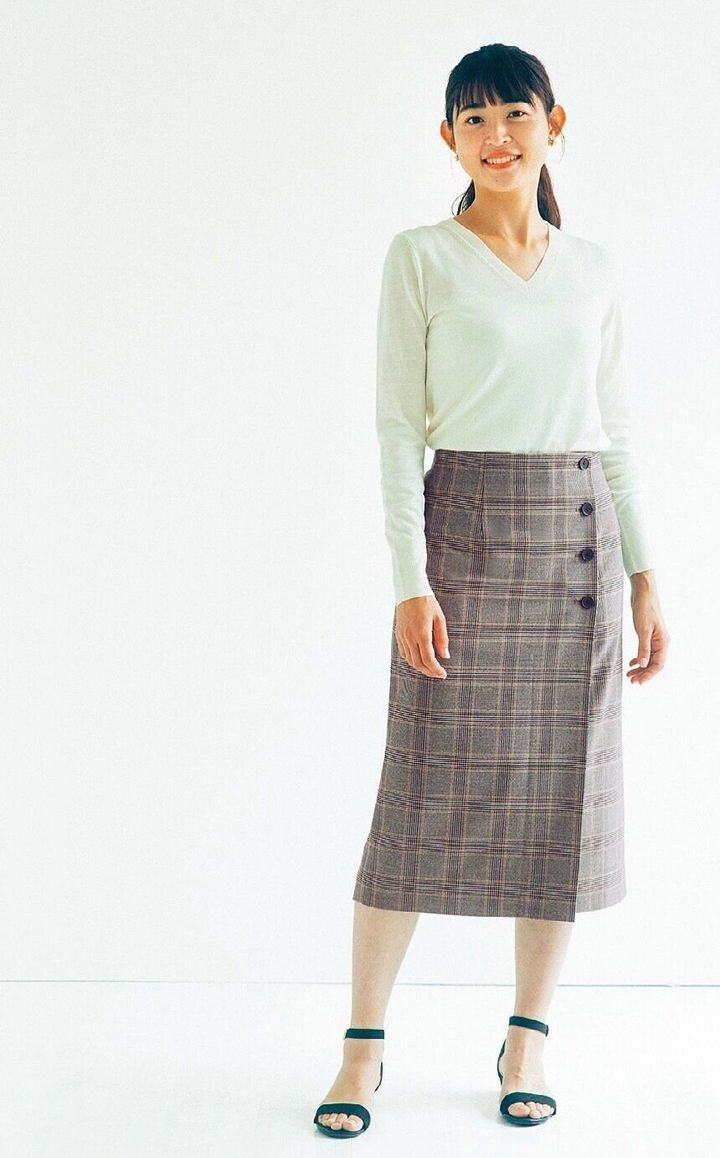 □褒められるアイテムは、コットンシャツ、 シンプルなVネックニット、ひざ丈タイトスカート、センタープレスパンツ