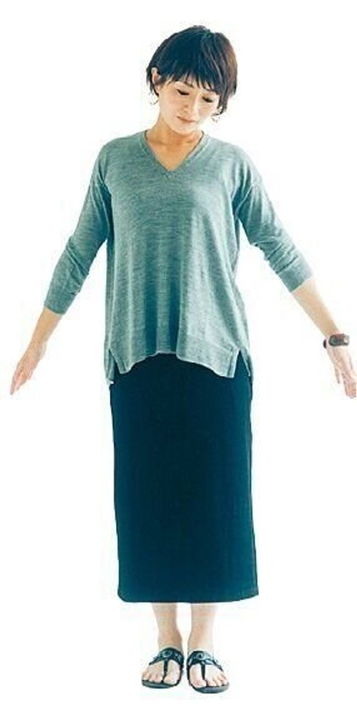 テロンとした薄手のニットは、肩幅を強調。肩からすそにかけてストンと落ちることで、ウエストのくびれを完全に消し去り、ずんどうな体形に見せてしまう。