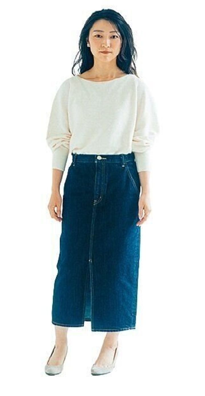 重心が下がりがちなウェーブさんにとって、下半身の重さを強調するデニムは苦手なアイテム。デニムのロングスカートは、ドーンと太く、短い脚に見せてしまうので要注意。