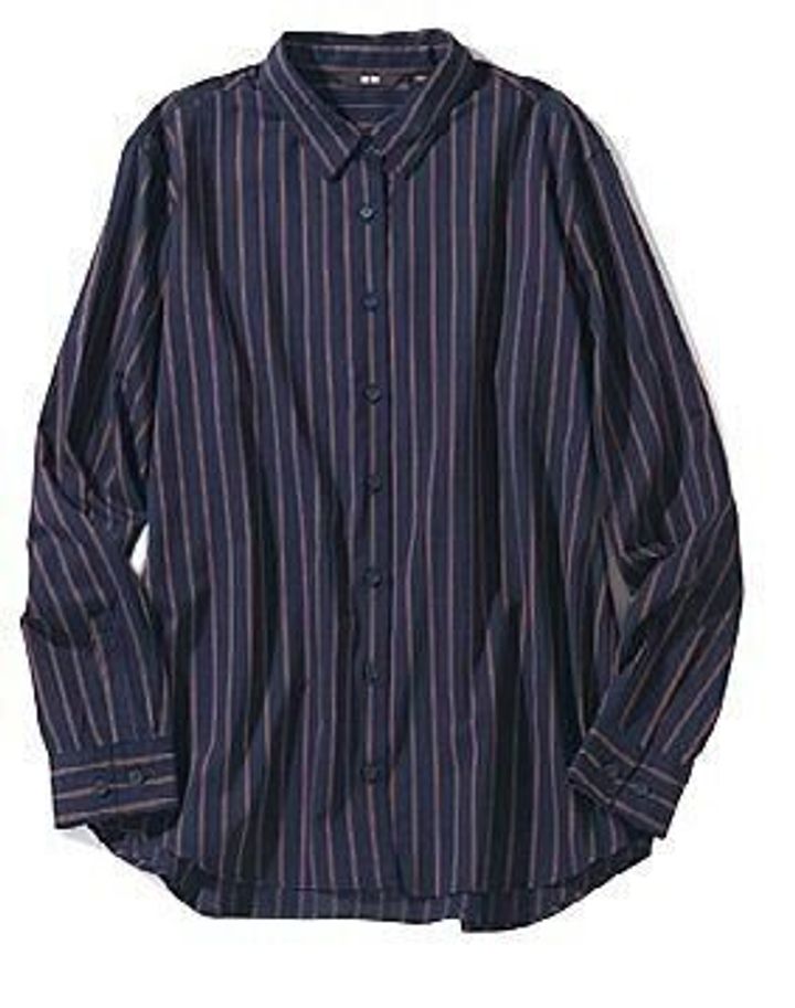 レーヨンなどの上質感のあるシャツはストレートさんの得意分野。首もとにゆとりがあり、ピンストライプ柄だとさらに着やせ効果大。/ユニクロ
