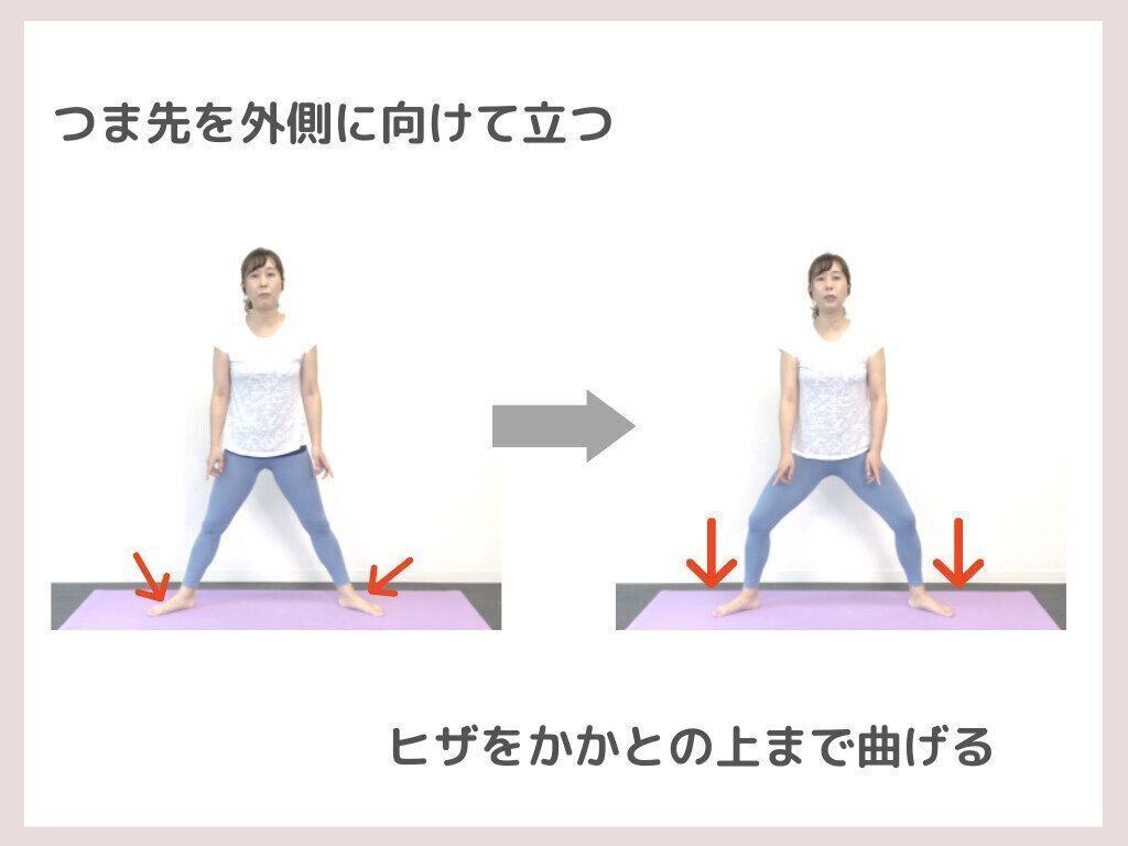 (1) 立った状態で足をお尻よりも広めに開きます。
