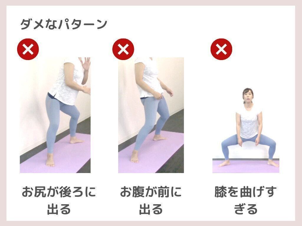 お腹が前に出た状態でやってしまうと、太ももの内側が使えずに、太ももの前側に力が入ってしまうのでやめましょう。