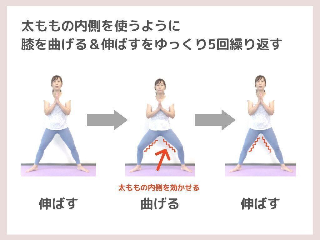 程よく太ももの内側を鍛えたいだけなので、膝はかかとの上までを目安に曲げて行いましょう。