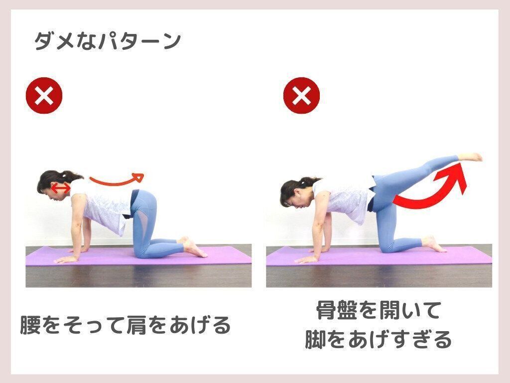 これをやると体幹が安定せずに効果が半減してしまいます。肩は下げてお腹はマットと平行で行いましょう。