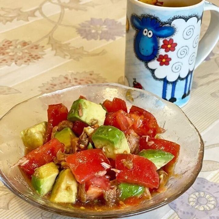 この日のお昼ごはんは、トマト・アボカド・ツナを盛りつけたサラダでした。コロコロとした見た目がかわいらしく、食べやすいサイズ感です。バルサミコス酢やオリーブオイルなどを合わせたドレッシングをかけていて、さっぱりとした味わいなのだそう。
