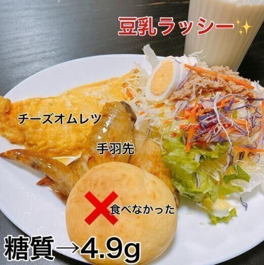 3人の子どもを育てながら、安くて簡単な糖質オフごはんで10kgの減量に成功したraiya_dietさん。この日の朝ごはんは、チーズオムレツ・手羽先・サラダに豆乳ラッシーとボリューム満点!豆乳ラッシーは、豆乳ヨーグルト・豆乳・甘味料・レモン汁を混ぜたもので、余ってしまった豆乳ヨーグルトをおいしく消費できたそうです。