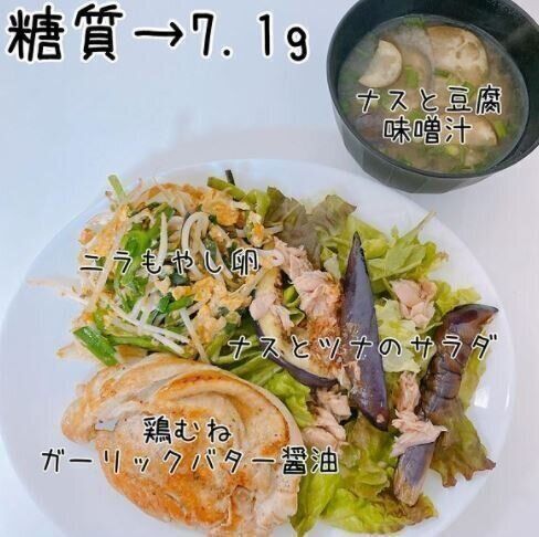 ある日の夜ごはんメニューは、鶏胸肉のガーリックバターしょうゆ・ニラもやし卵・ナスとツナのサラダ・ナスと豆腐のみそ汁。鶏胸肉は、酒とショウガに漬け込んだ肉をフライパンで焼き、バター・すりおろしにんにく・しょうゆで味つけしています。鶏胸肉は加熱しすぎるとかたくなるため、先に取り出して残ったソースだけ煮詰めるのがポイントです。