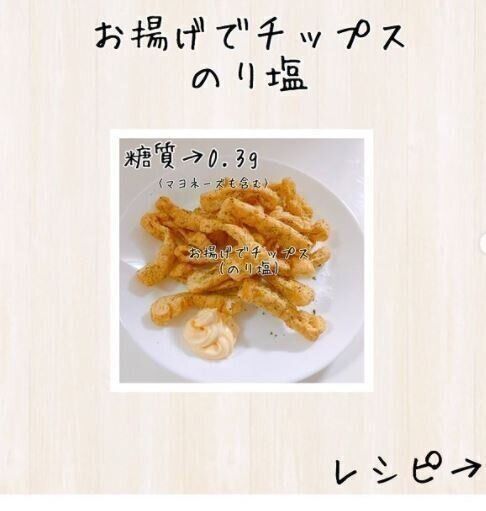 キッチンペーパーに油揚げを包み、電子レンジで30秒ほど加熱して油抜きをします。油揚げを好みのサイズにカットして皿に並べ、再度電子レンジで加熱。油揚げがカリカリになったら塩・青のりで味つけし、マヨネーズを添えて完成です。油揚げは低糖質なので、ダイエット中のおやつやおつまみにもおすすめなのだとか。