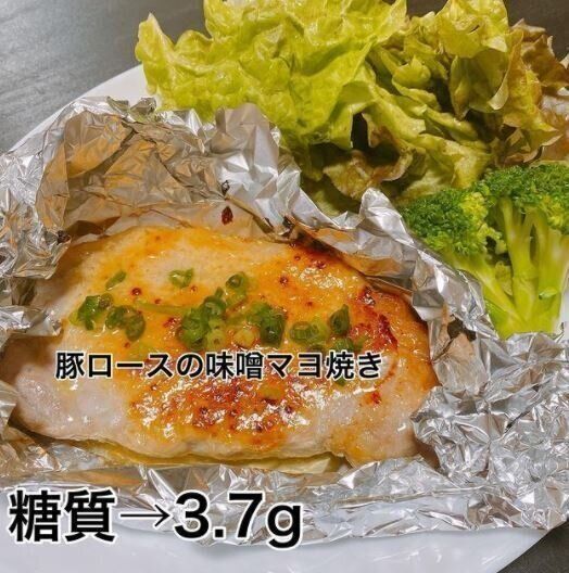 この日は、昼ごはんに豚ロースのみそマヨ焼きを食べました。アルミホイルにオリーブオイルをかけた豚肉をのせて、魚焼きグリルで焼いていきます。ある程度両面が焼けてきたら、みそ・マヨネーズ・甘味料を混ぜたソースをかけて完成。トッピングには、ネギを散らしています。