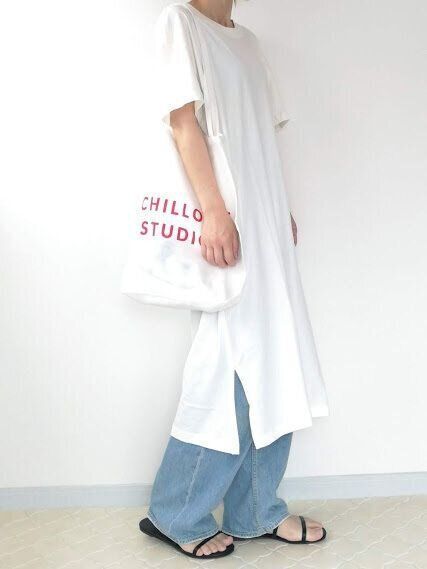 プレーンなTシャツワンピースのコーデ。アクセサリー代わりとして、目立つロゴのトートバッグを持ってみました。