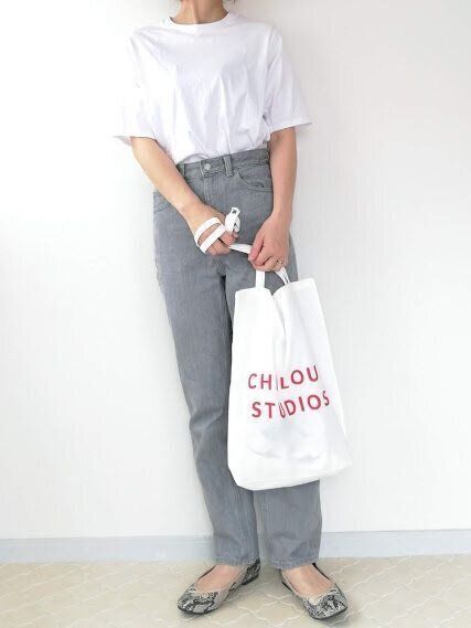 白T×デニムの超シンプルコーデ。トートバッグの赤ロゴが引き立ち、コーディネートが華やぎます。