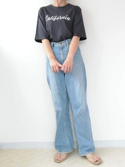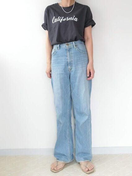 160cmの筆者が着るとこんな感じになりました。ゆるシルエットのTシャツは、そのまま着るだけだと野暮ったいシルエットに……あか抜けて見える着こなしって?
