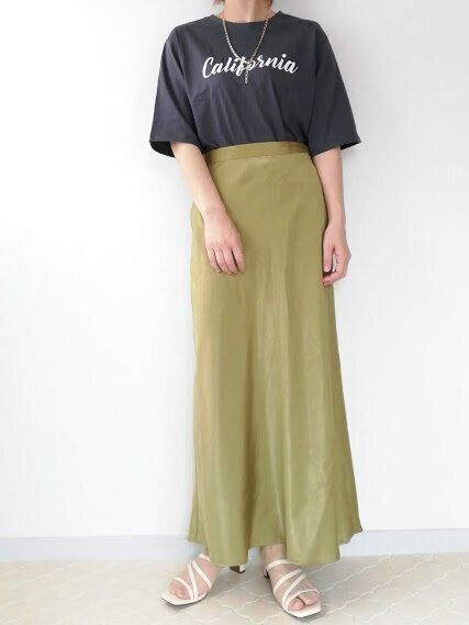 女度強めのサテンスカートにロゴTを合わせることで、こなれた印象のカジュアルMIXコーデが完成します。