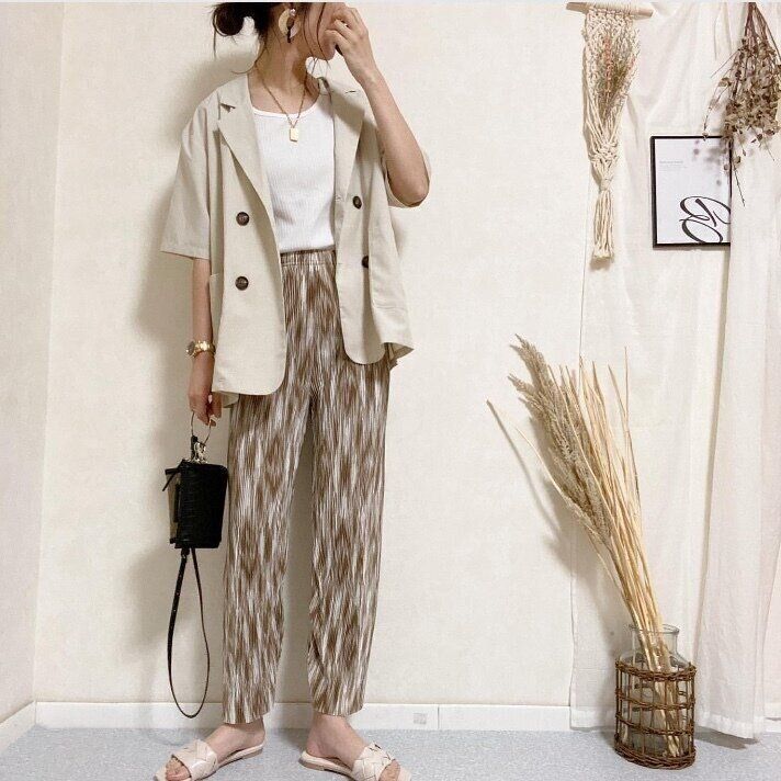 プリーツパンツを合わせることで身長も高くスタイルがよく見えるので、低身長さんにもおすすめのコーディネートです。