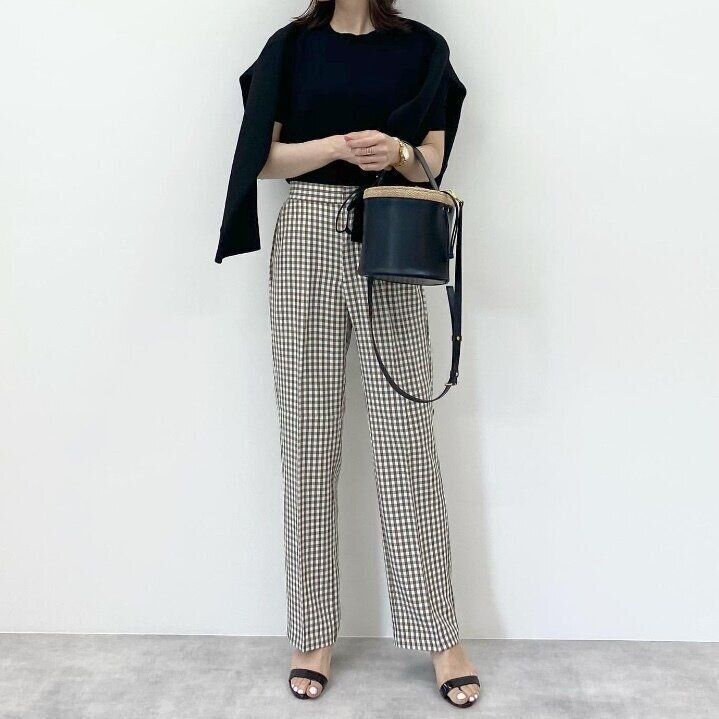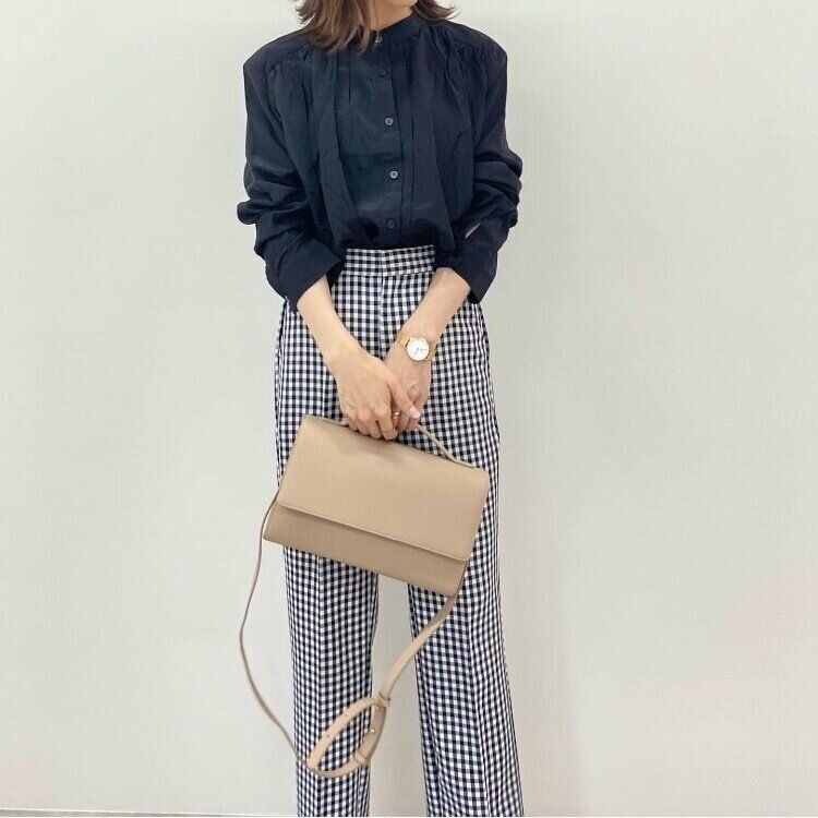 デザイン性のある黒のブラウスを合わせたコーディネートは、パンツのギンガムチェックに白が入っていることで、重たくなりません。