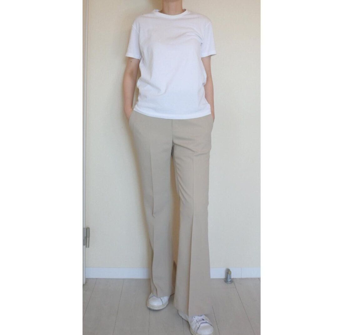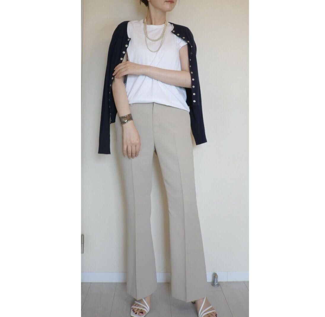センタープレスの入ったフレアパンツなら脚長にもみえます。