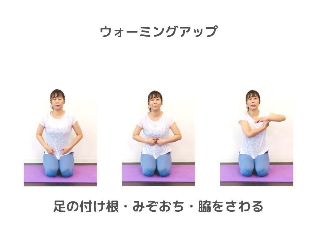 準備運動として、足のつけ根・みぞおち(おへそから指を4本上に上げた場所)・両脇をさわります。