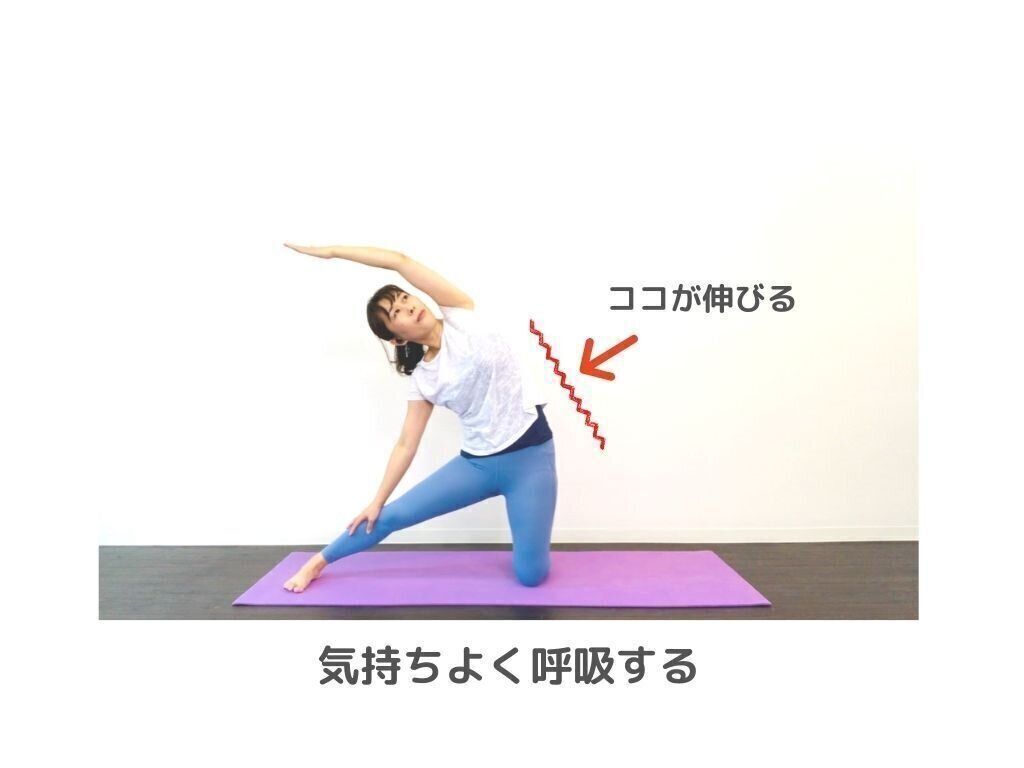 脇腹が気持ちよく伸びているところでゆっくり呼吸します。